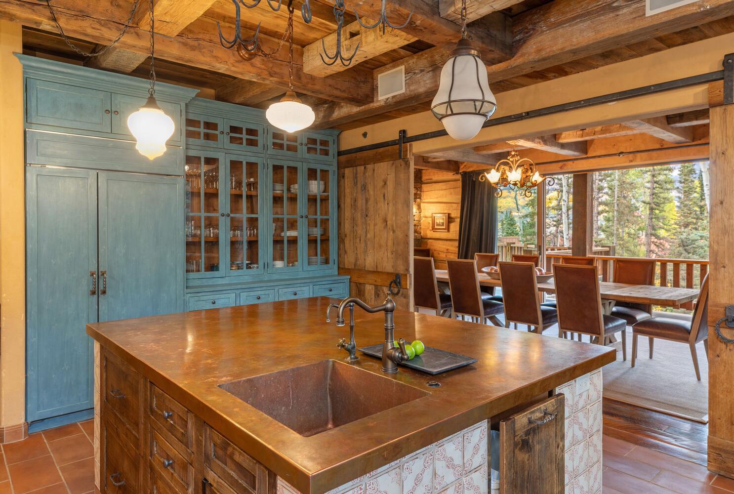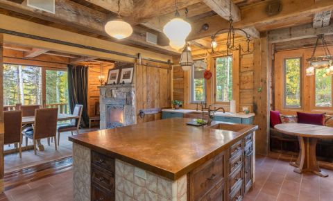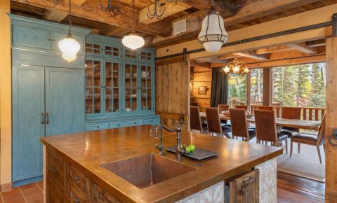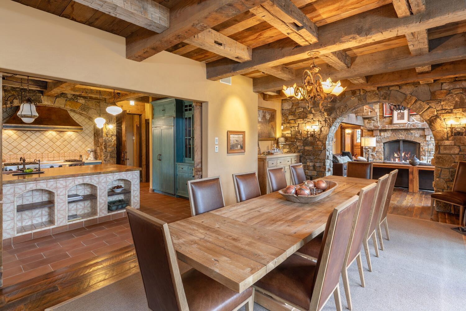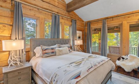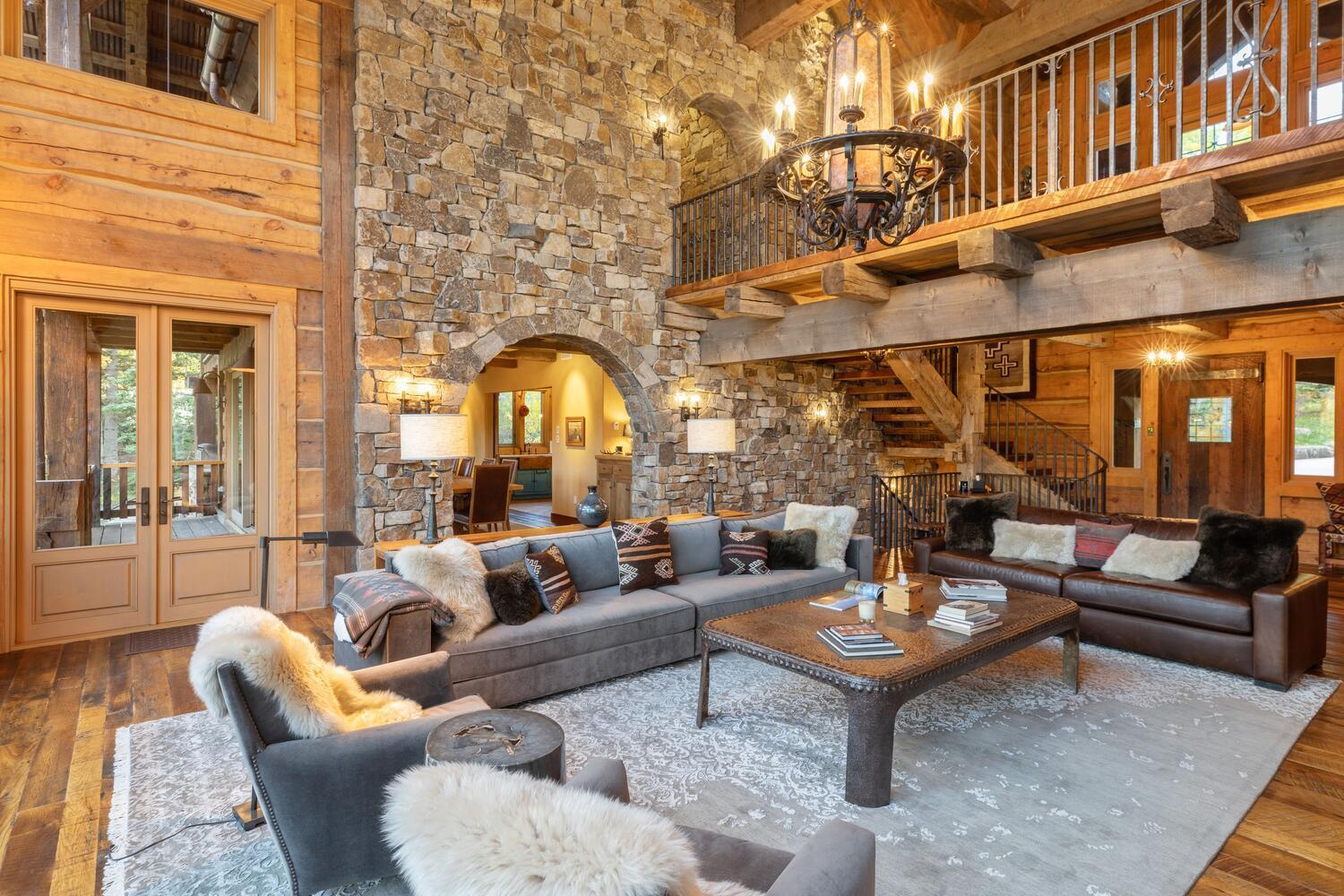 This home is dialed and ready for you to use this Ski Season. Why wait another year? Ski right to the door of this luxurious mountain retreat. Directly trailside on the Bridges ski run. Anchored by hand-hewn logs, extensive stonework, and reclaimed beams throughout, the home's warm, cozy spaces invite intimate family evenings while grand entertaining areas can accommodate large gatherings of family and friends. The gorgeous great room features a wood-burning fireplace and floor-to-ceiling windows that showcase the awe-inspiring St. Sophia views. With four primary suites, a bedroom and separate guest quarters, there is plenty of room for everyone to be comfortable. The large gourmet kitchen features a custom copper-topped island, eat-in dining areas, dining areas,