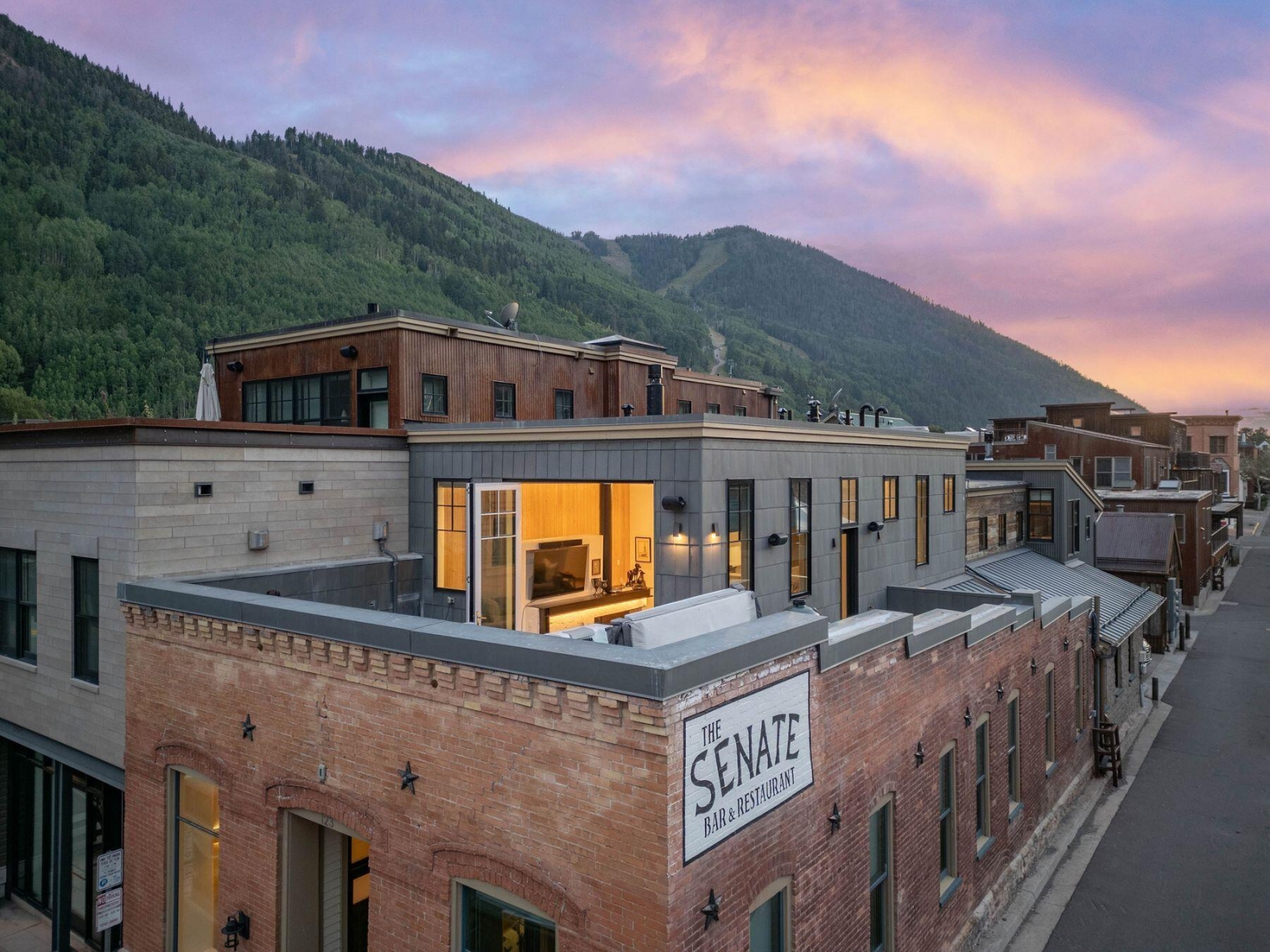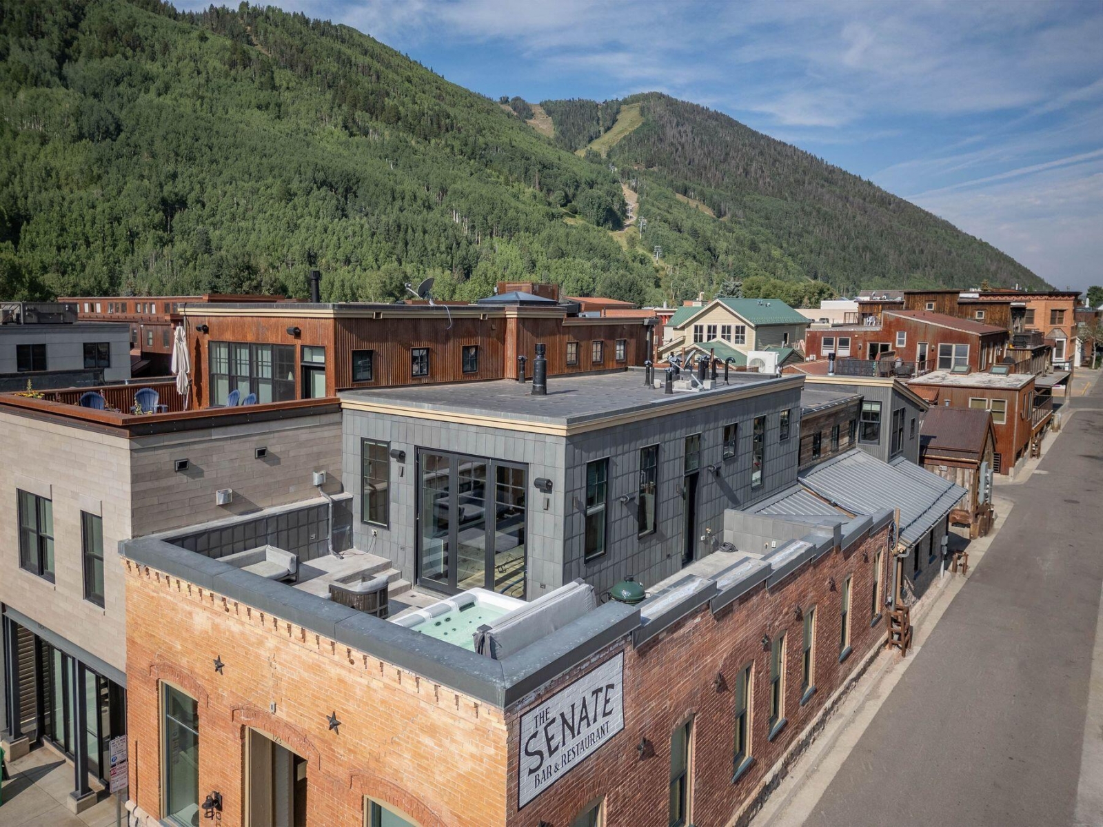 The Historic Senate Building - Telluride's Premier Luxury Townhome. Meticulously reimagined by acclaimed local architect Tommy Hein, the Historic Senate Building stands in one of Telluride's most coveted locations-just half a block from Main Street, a short stroll to Town Park, and only minutes from the Gondola and Chair 8. Spanning 5,699 square feet of living and commercial space, this remarkable residence blends timeless character with modern luxury. The home showcases an expansive chef's kitchen, formal dining for ten, and four bedrooms with ensuite baths, complemented by a spacious flex room. Additional highlights include a second living/media game room with wet bar, ski locker room, sauna, air conditioning, hot tub and one of the most sought-after outdoor patios in Telluride.